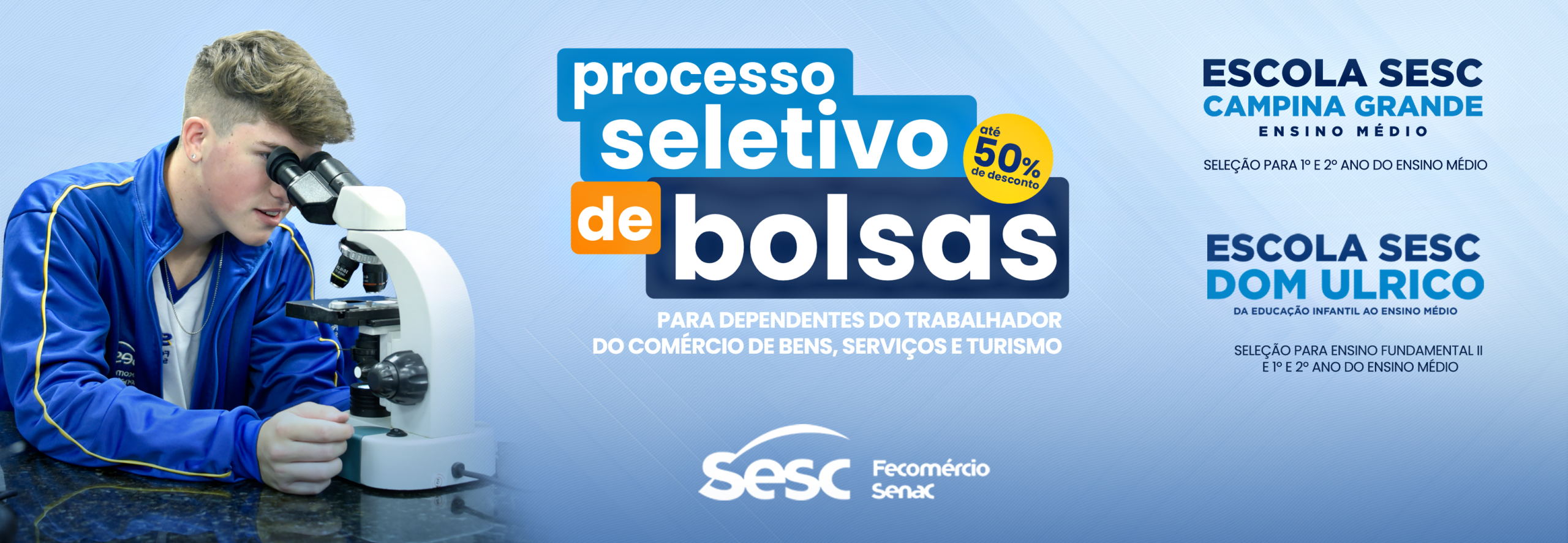 Nas Escolas Sesc Dom Ulrico e Sesc Campina Grande, seu filho do Fundamental II ou 1º ou 2º ano do Ensino Médio podem ganhar bolsas de até 50% de desconto!