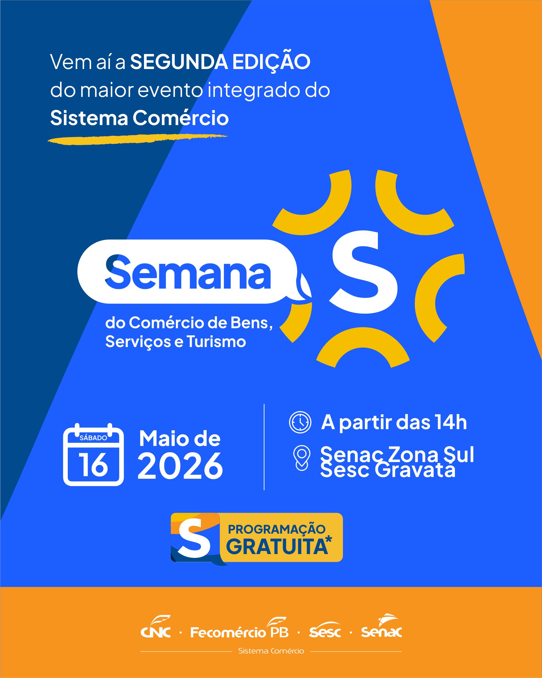 A Paraíba já entra no clima da Semana S do Comércio 2026, o maior evento integrado do Sistema Comércio no Brasil, que promete movimentar diversas cidades do estado com uma ampla programação gratuita voltada para toda a população. Promovida pelo Sistema Fecomércio/Sesc/Senac, a iniciativa acontecerá no dia 16 de maio, com atividades distribuídas em João Pessoa, Campina Grande, Areia, Guarabira, Picuí, Patos, Sousa e Cajazeiras, reunindo ações nas áreas de educação, saúde, cultura, lazer, tecnologia e qualificação profissional.
