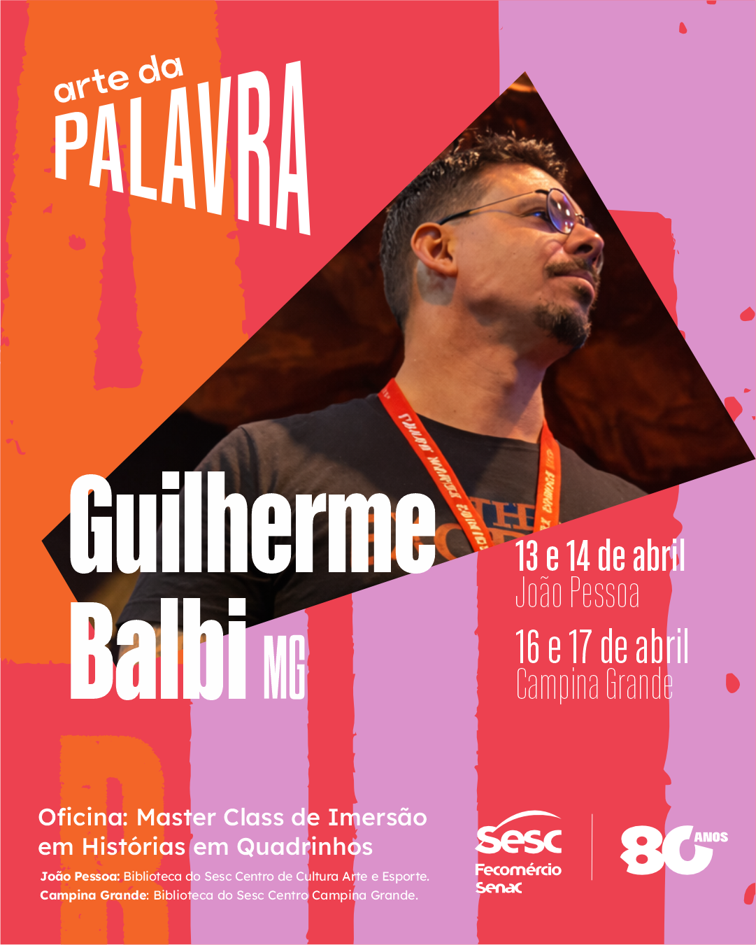 O Sesc Paraíba realiza, no mês de abril, a Master Class de Imersão em Histórias em Quadrinhos, ministrada pelo quadrinista mineiro Guilherme Balbi, profissional com mais de uma década de atuação e trabalhos publicados por grandes editoras internacionais, como Marvel Comics, DC Comics, Dark Horse Comics, IDW Publishing e Valiant Comics.