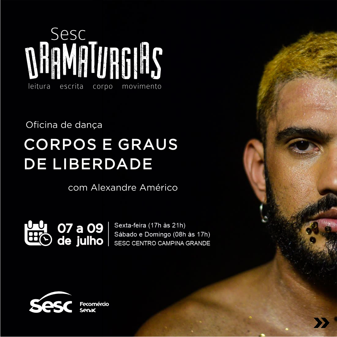 O Sesc Paraíba, através do projeto Dramaturgias, recebe Alexandre Américo, bailarino de formação, pesquisador da dança, coreógrafo, mestre e PHD em artes cênicas para ministrar a oficina de dramaturgia que traz o tema Corpos e Graus de Liberdade. A formação acontecerá dos dias 7 a 9 de julho, no Sesc Centro Campina Grande, na sexta-feira das 17h às 21h, no sábado e domingo, das 8h até às 17h. Para se inscrever basta clicar no link https://forms.gle/oHnzUqypP8CH62VCA. A ação é destinada a bailarinas/os (qualquer linguagem), atrizes/atores, circenses e performers.